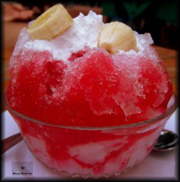 Buz, pişmiş nişasta, pudra şekeri ve şerbetten oluşur.