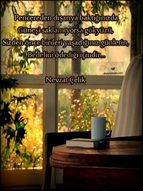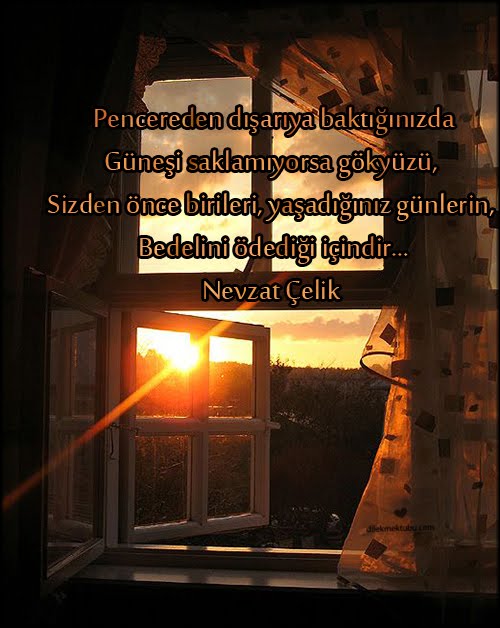Resimli Sözler Anlamlı Sözler, Resimli Sözler Dilek Mektubu 22 Eylül 2017 0 Yorumlar Bedel Pencereden dışarıya baktığınızda Güneşi saklamıyorsa gökyüzü Sizden önce birileri yaşadığınız günlerin Bedelini ödediği içindir. Nevzat Çelik