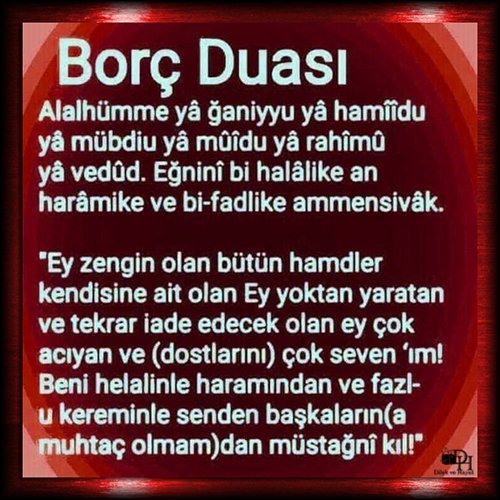 Dini Mesajlar Dini Resimler, Dualar ve Ayetler Dilek Mektubu 20 Şubat 2017 0 Yorumlar Borç Duası Ey zengin olan bütün hamdler kendisine ait olan Ey yoktan yaratan ve tekrar iade edecek olan Ey çok acıyan ve dostlarını çok sevenim Beni helalinle haramından ve fazlu kereminle Senden başkalarından mustağni kıl.. Amin Borç Duası Allah Kabul Etsin