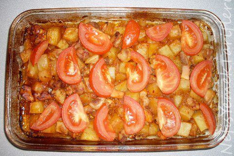 Bekletilen patatesler içerisine 2 kaşık yağ konulan tepsinin içerisine doğranmış soğanlar ile birlikte konulup önceden 200 dereceye kızdırılmış fırında 10 dakika pişirilir.