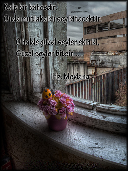 Resimli Sözler Anlamlı Sözler, Mevlana, Resimli Sözler Dilek Mektubu 6 Ocak 2017 0 Yorumlar Kalp Kalp bir bahçedir. Onda mutlaka bir şey bitecektir. O halde güzel şeyler ekin ki, Güzel şeyler bitsin. Hz. Mevlana