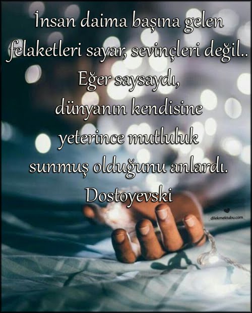 Resimli Sözler Anlamlı Sözler, Resimli Sözler Dilek Mektubu 31 Aralık 2017 0 Yorumlar Mutluluk İnsan daima başına gelen felaketleri sayar, sevinçleri değil.. Eğer saysaydı, Dünyanın kendisine yeterince mutluluk sunmuş olduğunu anlardı.. Dostoyevski
