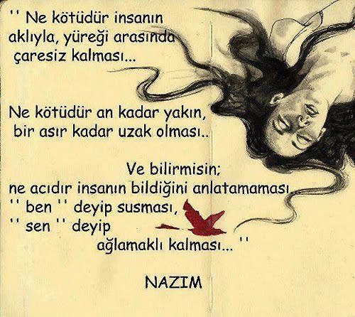 Şiirler Kısa Şiirler, Resimli Güzel Yazılar Dilek Mektubu 10 Ocak 2018 0 Yorumlar Ne Kötüdür Ne kötüdür, insanın aklı ile yüreği arasında çaresiz kalması. Ne kötüdür, an kadar yakın bir asır kadar uzak olması. Ve bilir misin ne acıdır, insanın bildiğini anlatamaması. BEN deyip susması, SEN deyip ağlamaklı kalması.. Nazım Hikmet Ran
