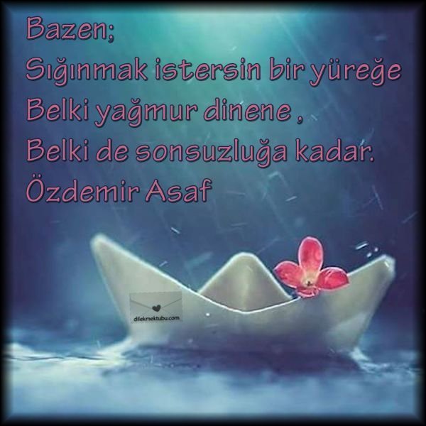 Resimli Sözler Anlamlı Sözler, Resimli Sözler Dilek Mektubu 4 Mart 2017 0 Yorumlar Sonsuza Kadar Bazen; Sığınmak istersin bir yüreğe Belki yağmur dinene , Belki de sonsuzluğa kadar. Özdemir Asaf
