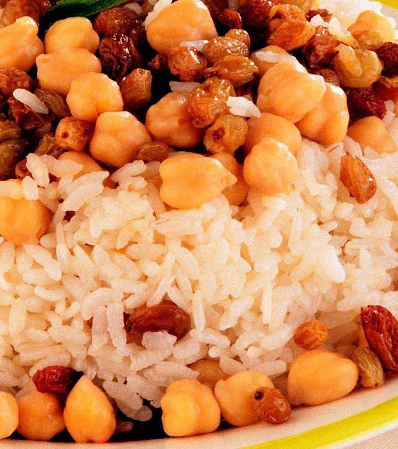 Karıştırıp üzerine haşlanmış nohut ve kuru üzümü yayın.