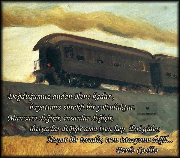 Resimli Sözler Anlamlı Sözler, Resimli Sözler Dilek Mektubu 14 Ocak 2017 0 Yorumlar Tren Doğduğumuz andan ölene kadar, hayatımız sürekli bir yolculuktur. Manzara değişir, insanlar değişir, ihtiyaçlar değişir ama tren hep ileri gider. Hayat bir trendir, tren istasyonu değil. Paulo Coelho