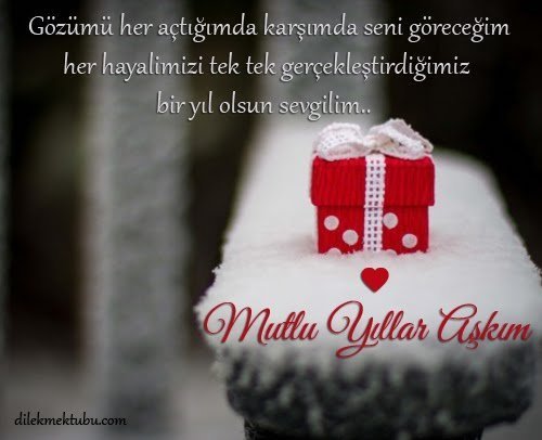 Yeni bir yıla seninle başlayacak olmanın güzelliğini bana yaşattığın için binlerce kez teşekkürler sevgilim. Dilerim ki yeni yıl bize daha çok aşkla, daha çok huzurla gelsin, attığımız her adım geleceğimize taşıyacağımız güzel anıları getirsin. Mutlu Yıllar Aşkım.